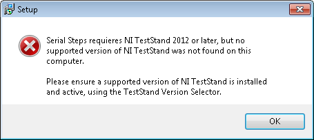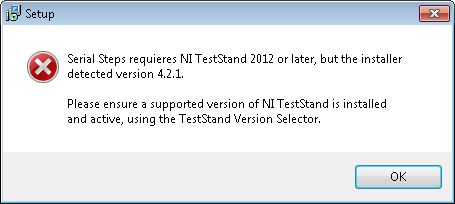 Serial Steps requires NI TestStand 2012 or later (refer to Prerequisites). If the installer detects an older version as active on your computer, an error message will be displayed, before the setup exit.