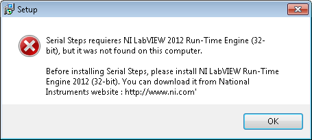 Serial Steps requires NI LabVIEW Run-Time Engine 2012 (32-bit). If the installer do not detects this Run-Tim on your computer, an error message will be displayed, before the setup exit.