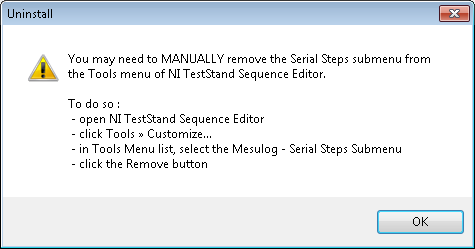 Caution Make sure to exit TestStand before uninstalling Serial Steps. |